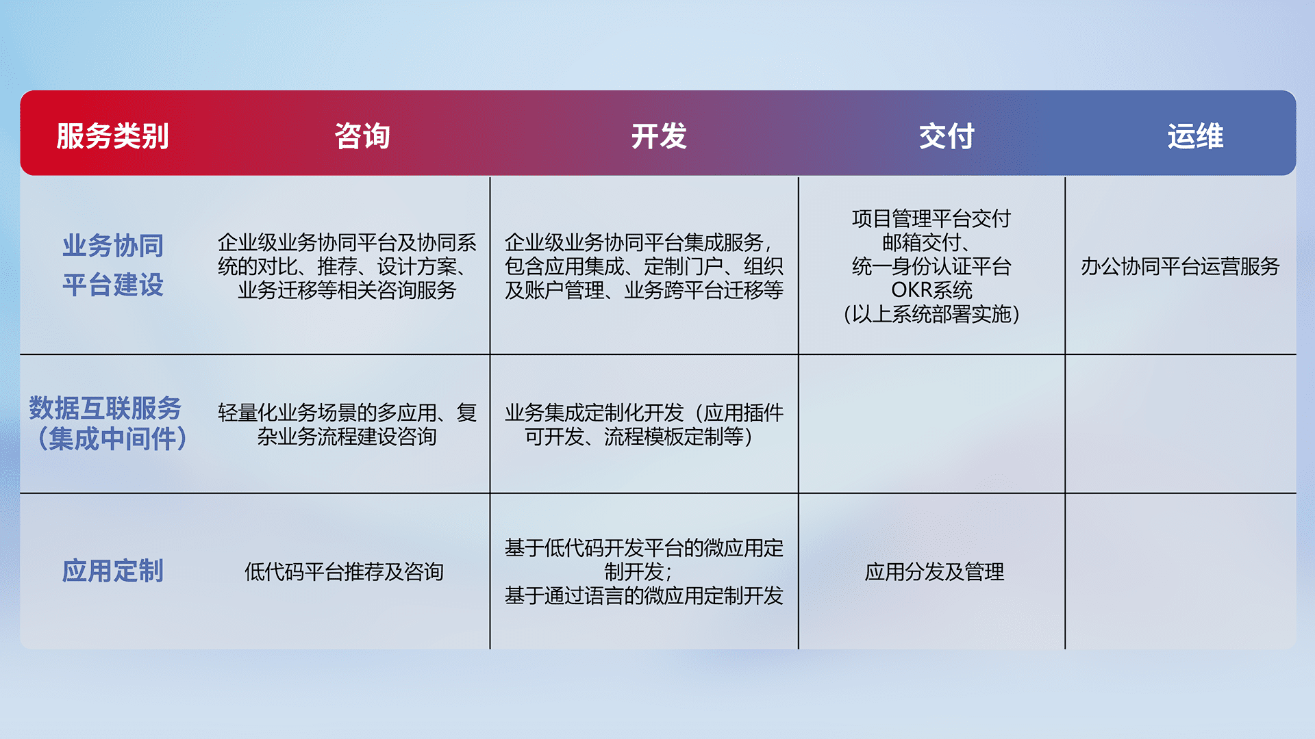 针对钉钉、、、、企微、、IDaas等平台级产品提供产品的规划、、方案、、、交付、、定制化开发等服务,,,,实现如统一协同办公、、、、智能客户服务、、混合会议管理、、、智能数据查询、、、等业务场景,,,实现数字化转型。。